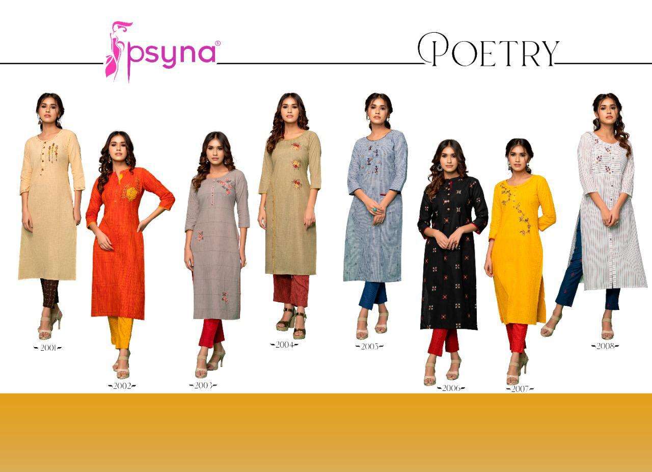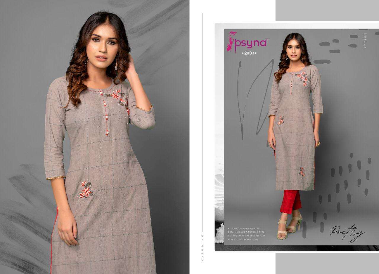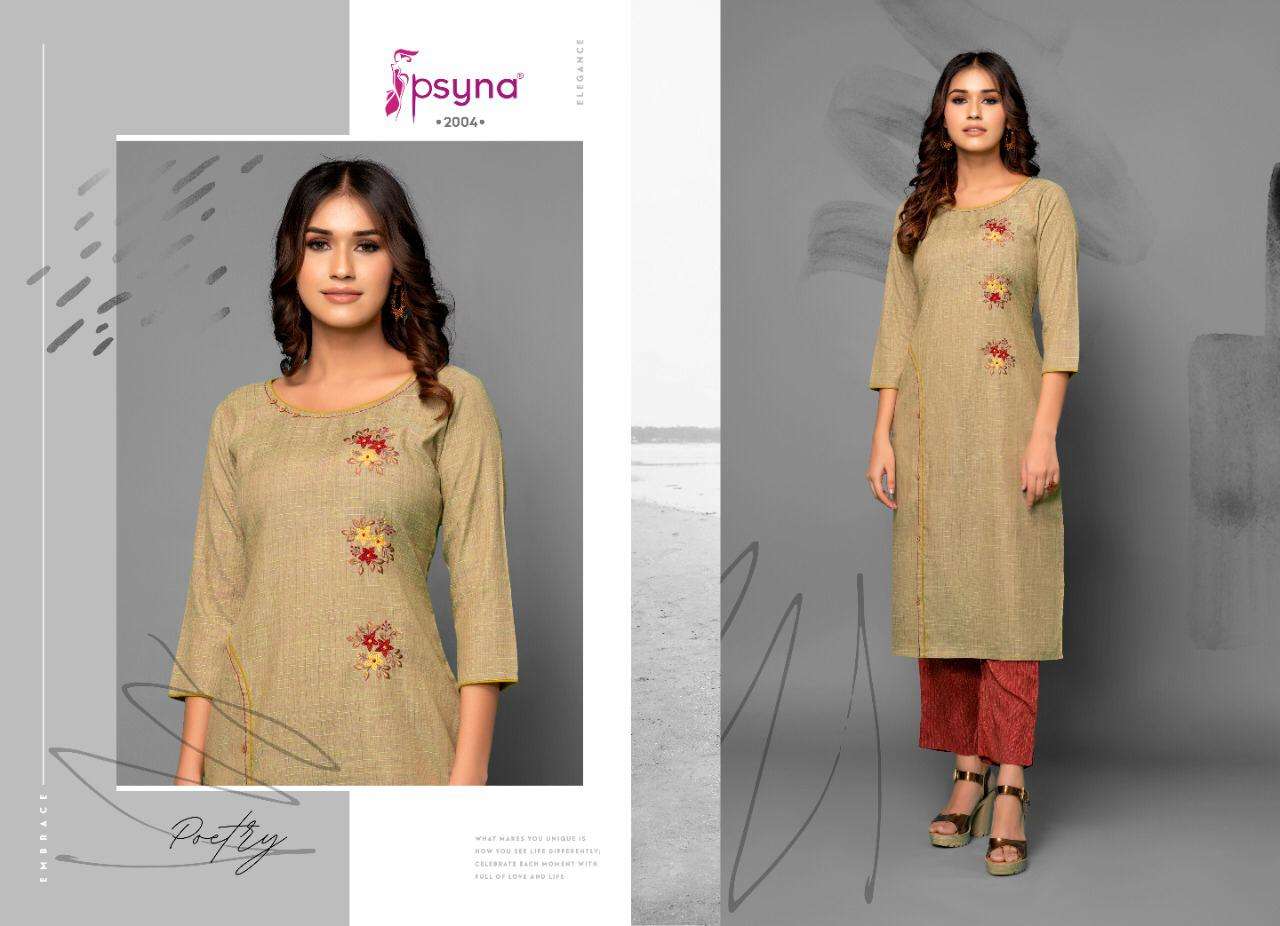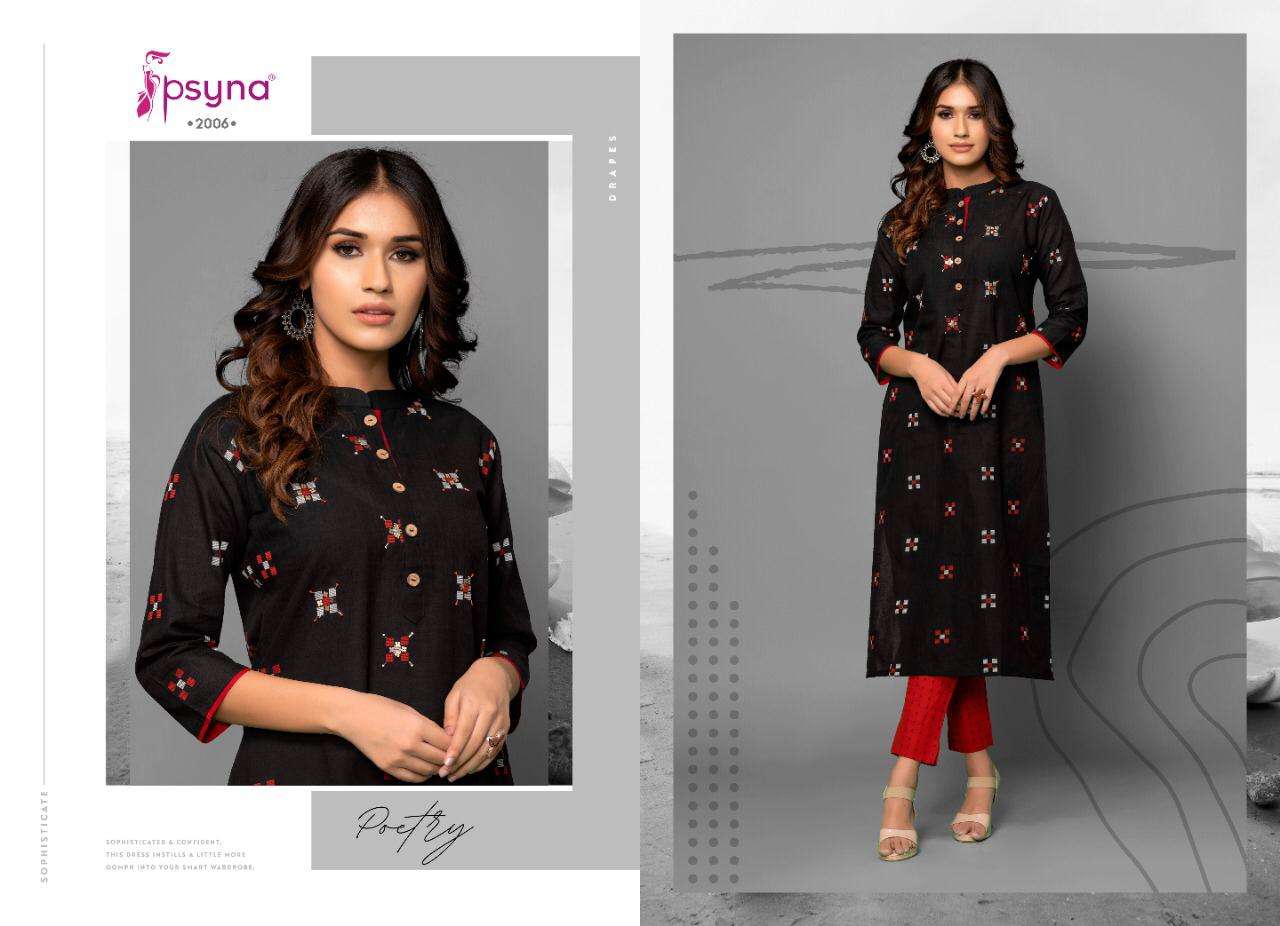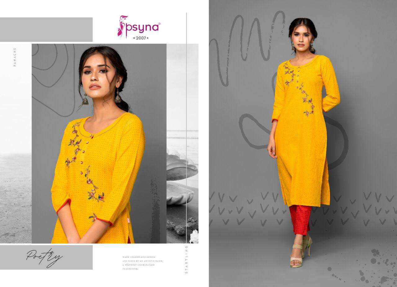 Buy Online PSYNA POETRY VOL 2 COTTON EMBROIDERY WORK KURTI WITH PANTS SETS SELLER 8 Pcs of Full Catalogue at Wholesale Price. Looking for PSYNA POETRY VOL 2 COTTON EMBROIDERY WORK KURTI WITH PANTS SETS SELLER Full Catalouge at Best Price? Buy Now PSYNA POETRY VOL 2 COTTON EMBROIDERY WORK KURTI WITH PANTS SETS SELLER at Wholesale Rate of Rs 6000 with Total 8 Pcs from authroized dealer and supplier of PSYNA Brand. Cost of Each piece is just only Rs 750 which is very low and affordable price to resale the product in your retail store ,This is Surat based Wholesale Supplier & Dealer of PSYNA Brand. Click on Brand name to Know more about PSYNA Brand's products.Call or Whatsapp on +91-6354092952 for booking or enquiry