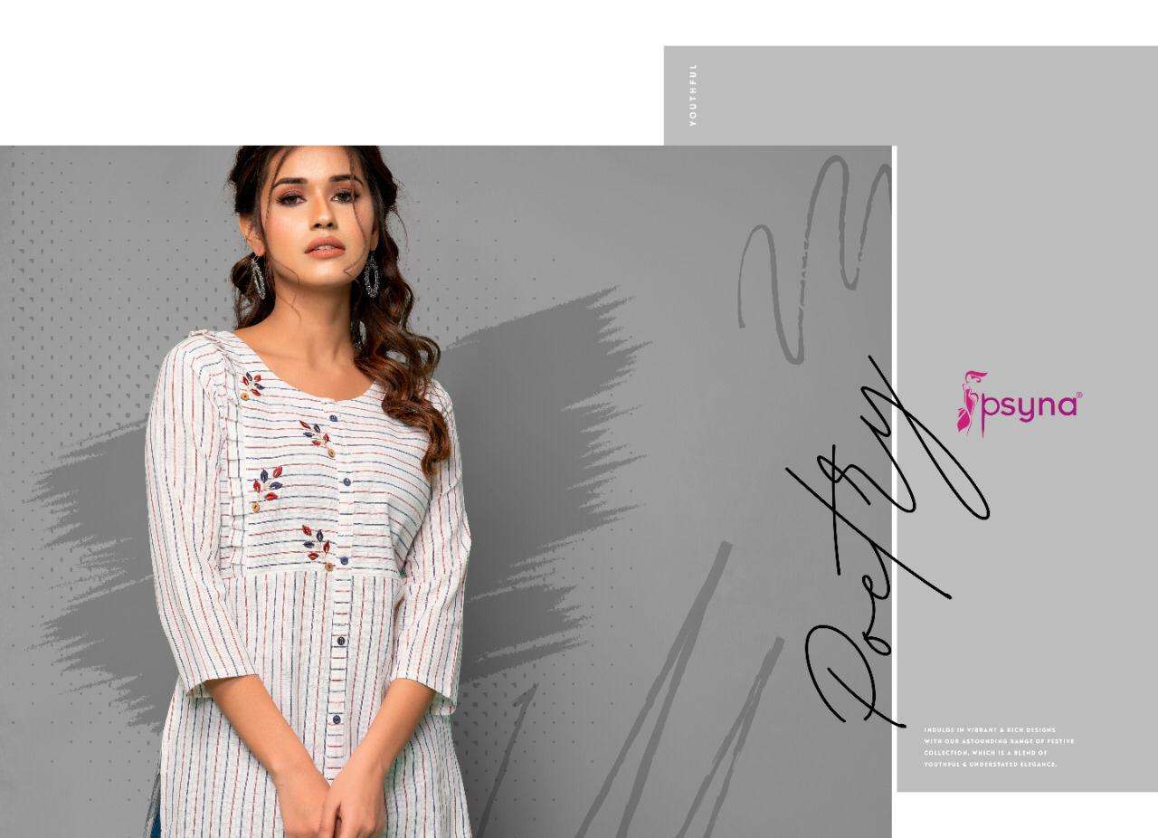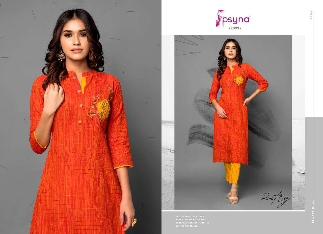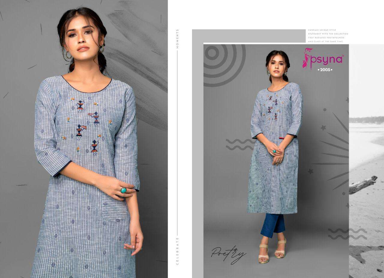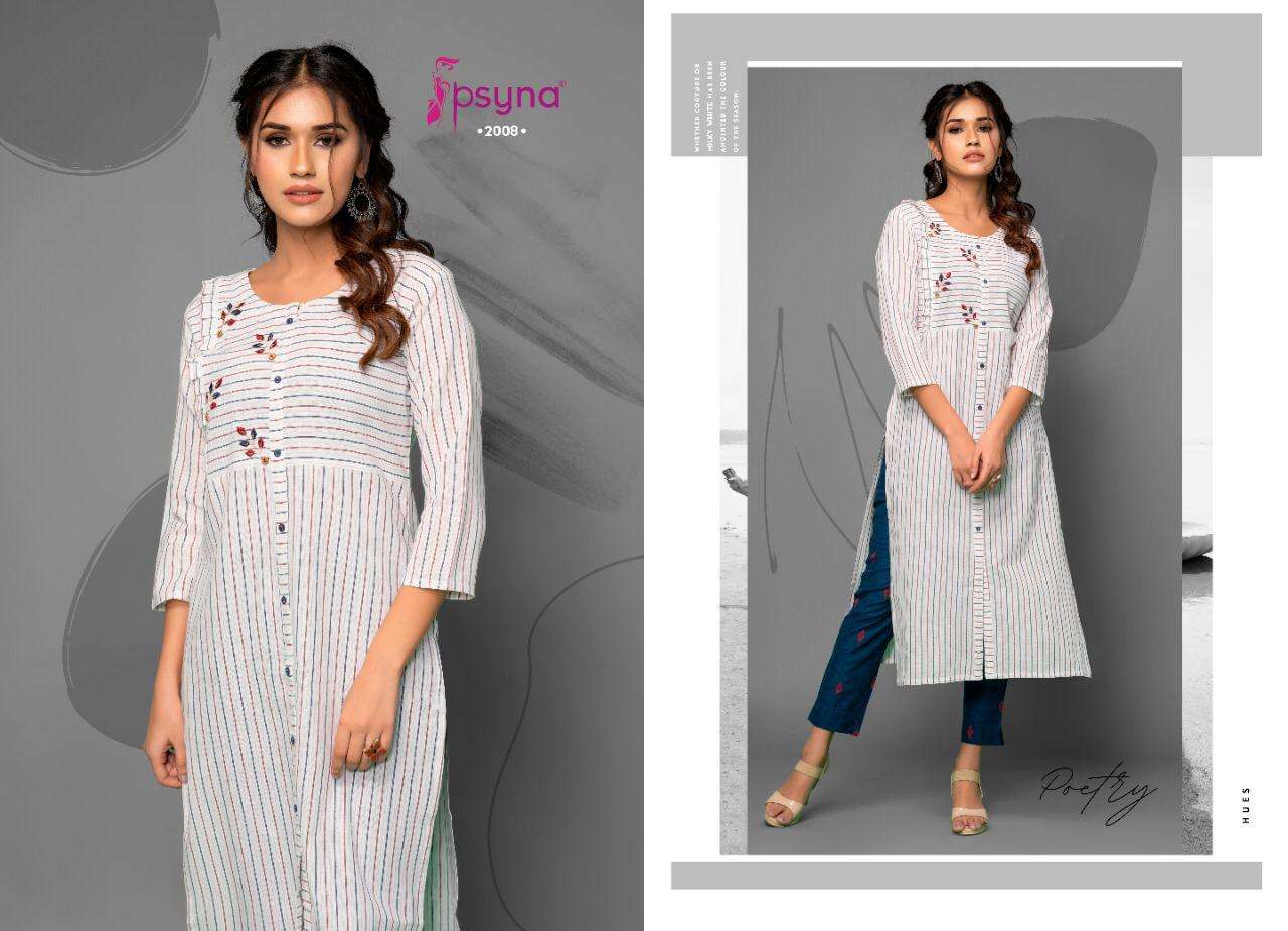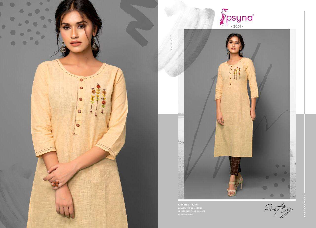 Buy Online PSYNA POETRY VOL 2 COTTON EMBROIDERY WORK KURTI WITH PANTS SETS SELLER 8 Pcs of Full Catalogue at Wholesale Price. Looking for PSYNA POETRY VOL 2 COTTON EMBROIDERY WORK KURTI WITH PANTS SETS SELLER Full Catalouge at Best Price? Buy Now PSYNA POETRY VOL 2 COTTON EMBROIDERY WORK KURTI WITH PANTS SETS SELLER at Wholesale Rate of Rs 6000 with Total 8 Pcs from authroized dealer and supplier of PSYNA Brand. Cost of Each piece is just only Rs 750 which is very low and affordable price to resale the product in your retail store ,This is Surat based Wholesale Supplier & Dealer of PSYNA Brand. Click on Brand name to Know more about PSYNA Brand's products.Call or Whatsapp on +91-6354092952 for booking or enquiry