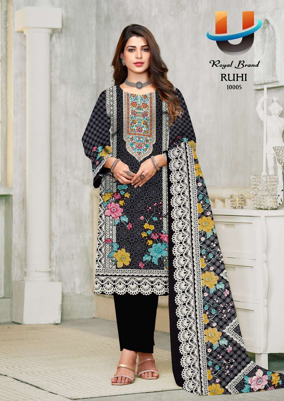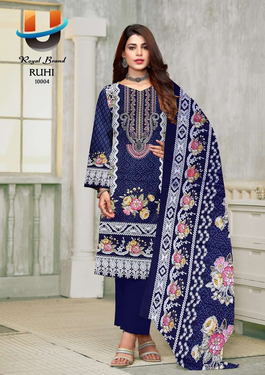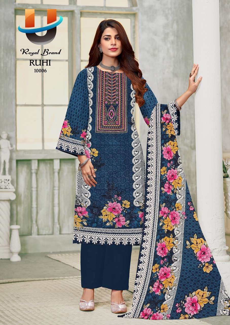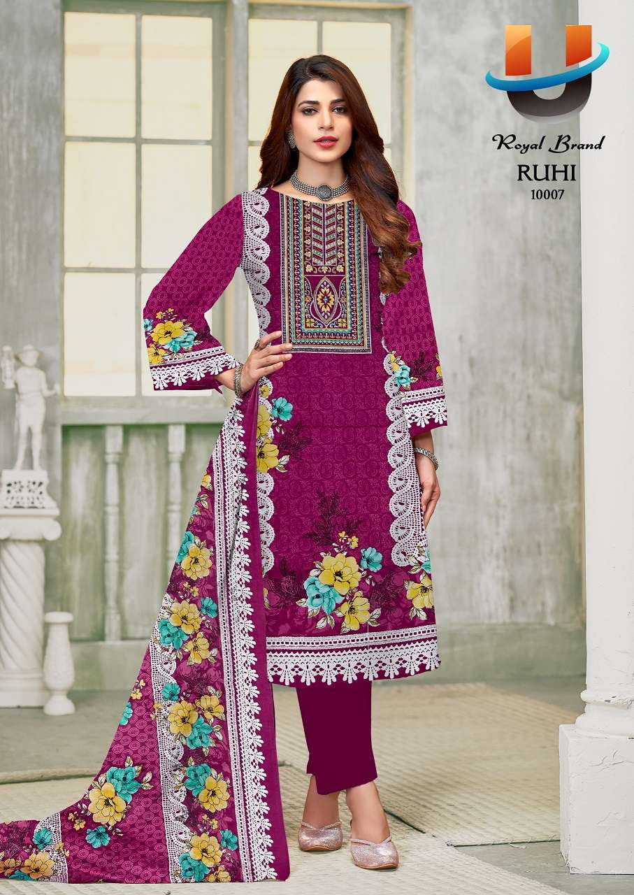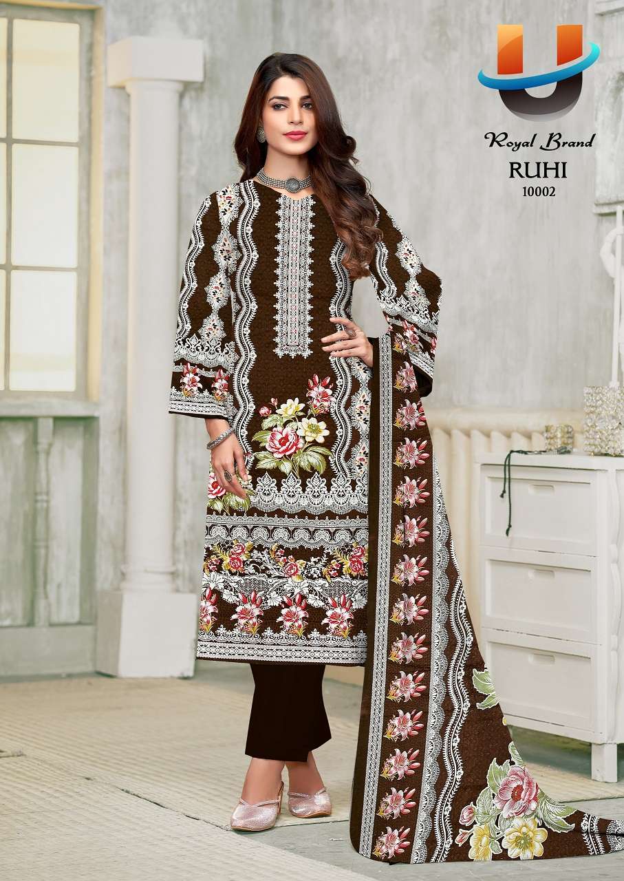 Buy Online Royal Ruhi Vol 10 Soft Karachi Cotton Printed Dress Material 8 Pcs of Full Catalogue at Wholesale Price. Looking for Royal Ruhi Vol 10 Soft Karachi Cotton Printed Dress Material Full Catalouge at Best Price? Buy Now Royal Ruhi Vol 10 Soft Karachi Cotton Printed Dress Material at Wholesale Rate of Rs 2040 with Total 8 Pcs from authroized dealer and supplier of Royal Brand Brand. Cost of Each piece is just only Rs 255 which is very low and affordable price to resale the product in your retail store ,This is Surat based Wholesale Supplier & Dealer of Royal Brand Brand. Click on Brand name to Know more about Royal Brand Brand's products.Call or Whatsapp on +91-6354092952 for booking or enquiry